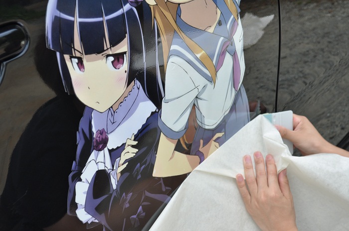 ヘラを使用してステッカーの貼り込みが完了すれば、このままの状態で水分がある程度乾燥するまで待ちます。 吹き付けた水が乾燥すれば、対象物への粘着力が強くなります。