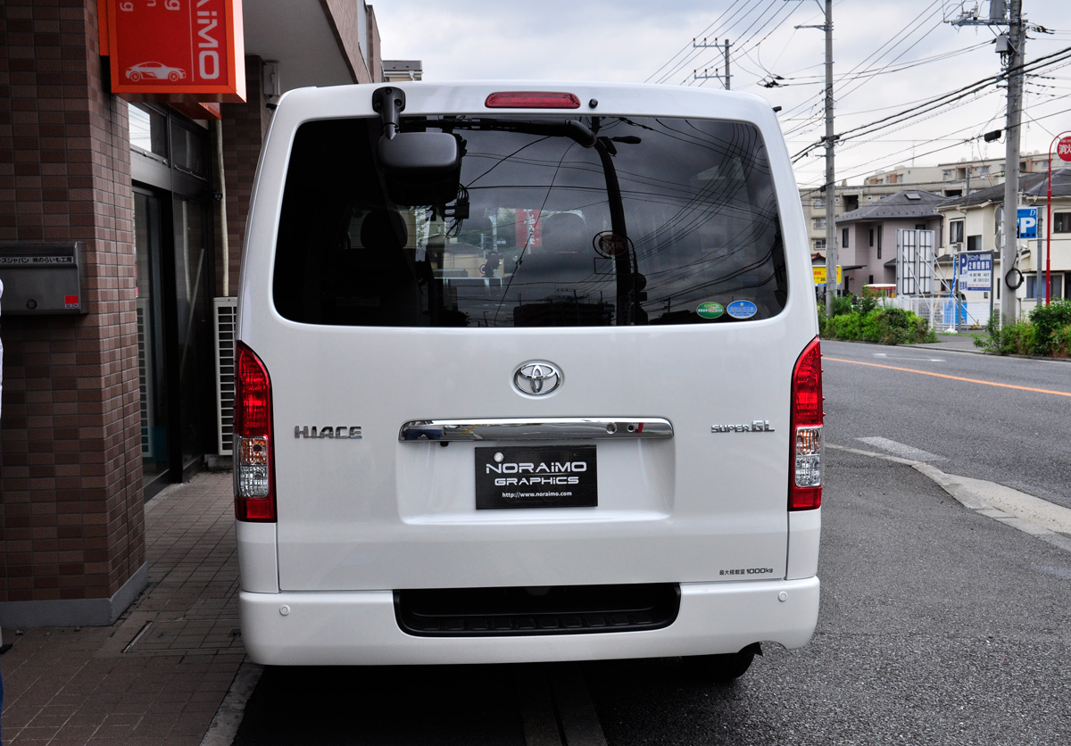 まだ走行34㎞の新車のハイエースのフロント・両サイド・リアにそれぞれカッティングステッカーやフルカラーステッカーの貼付け施工をしていきます。