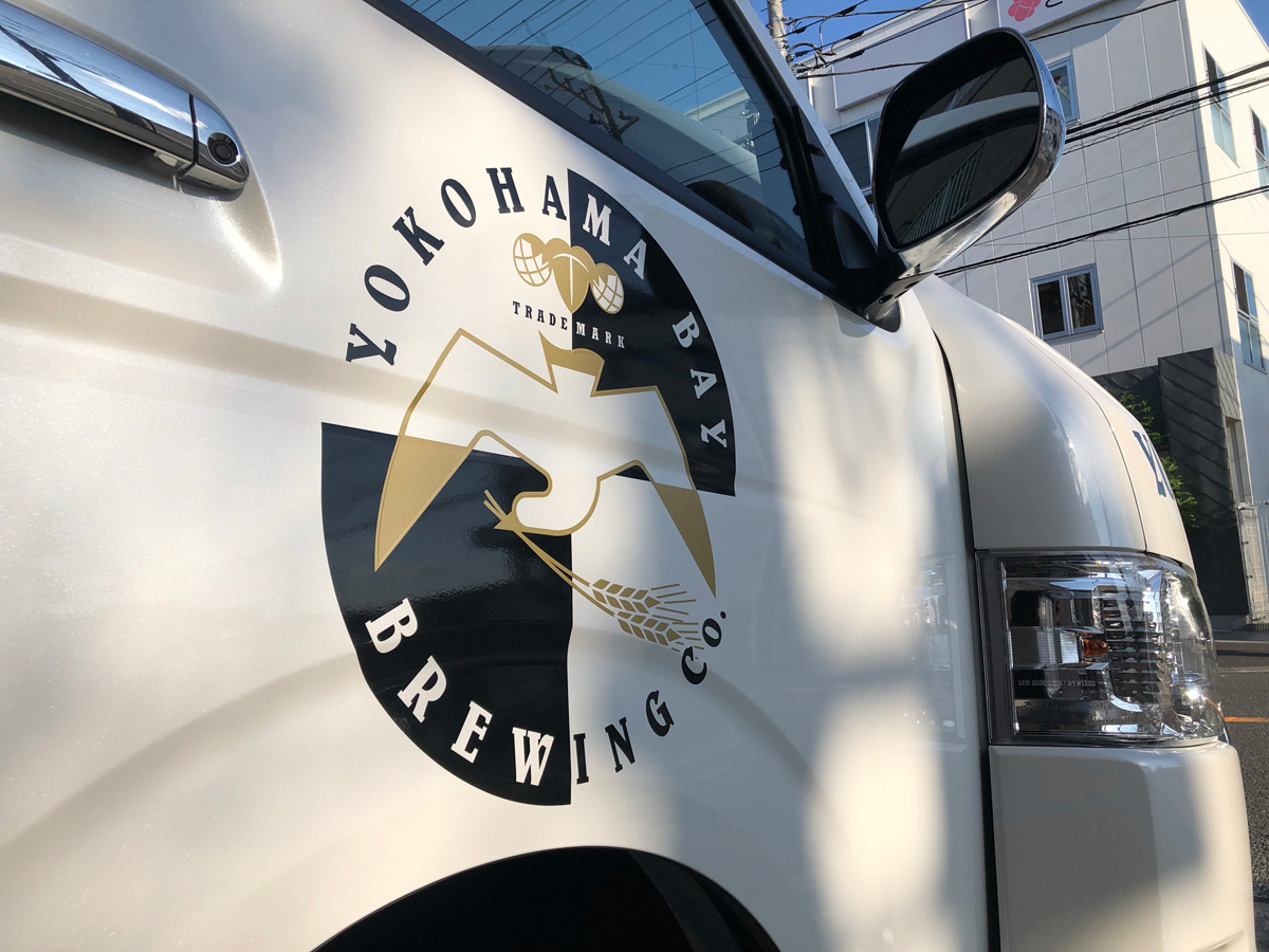 横浜ベイブルーイング自慢のビールと、それを担いでいる人たちを綺麗にハイエースに貼り付けていきます。