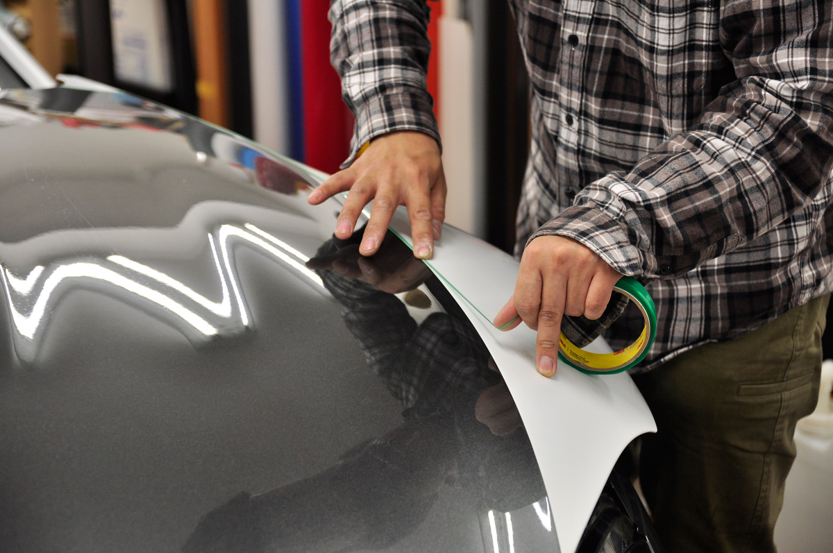 巨大なボンネットは1枚貼りが物理的に不可能なので、3分割にて施工します。