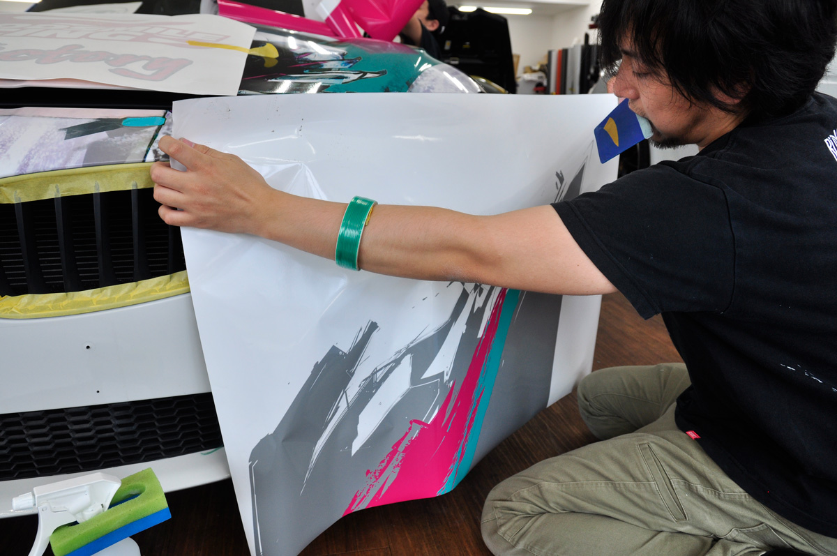 サイドに関しても同様、デザインデータを忠実に再現すべく正確な位置取りをし、貼り進めていきます。